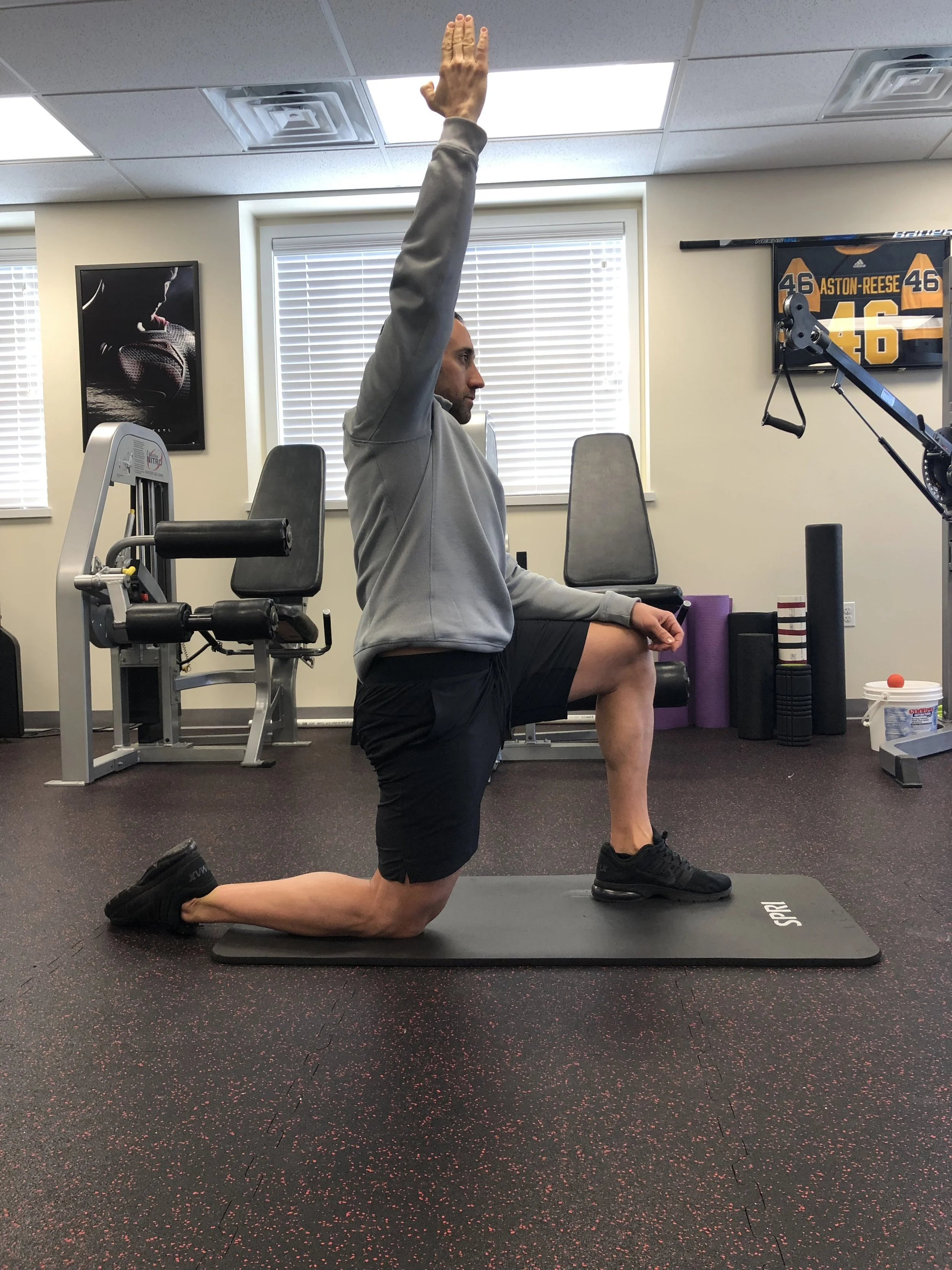 Be sure to: 1) Squeeze glutes 2) Gently push hips forward 3) Reach arm up overhead and slightly to the opposite wall