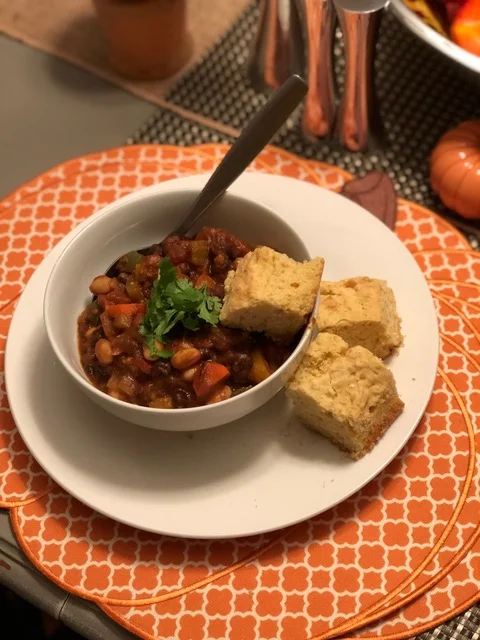 5) Serve right away with your favorite toppings. We did cilantro with a side of gluten free corn bread!
